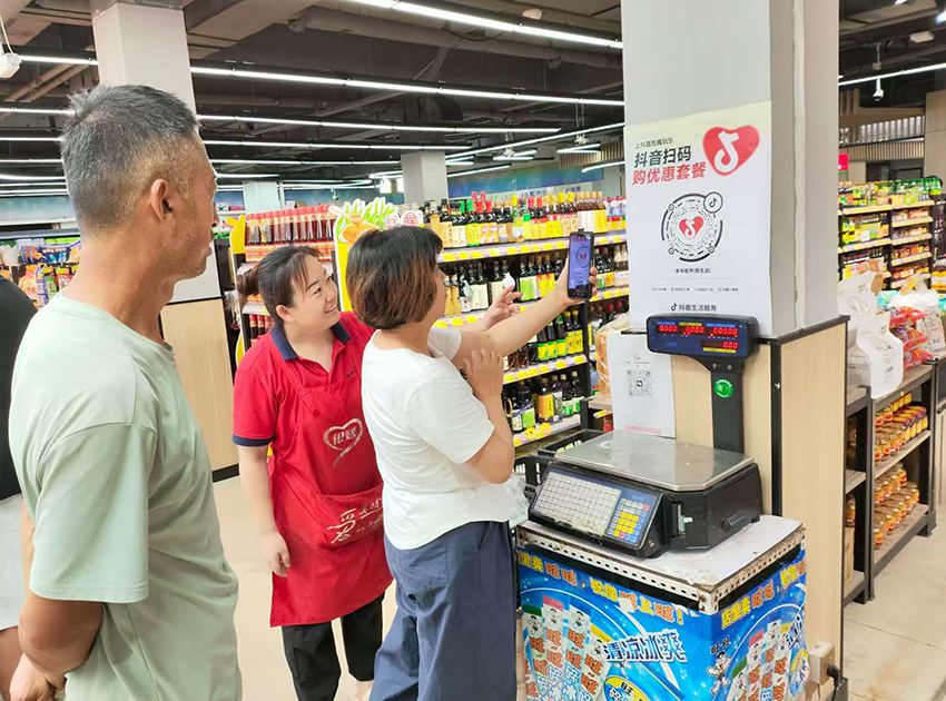 民生店张慕华热情帮助顾客操作抖音扫码,以方便顾客实时了解门店线上活动、购买线上特价商品。