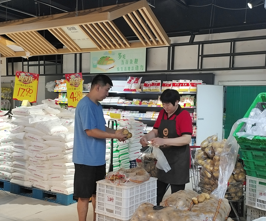 店庆期间,高新店同事们为方便顾客按需购买、减少排队时间,利用中午休息时间提前将土豆分级装袋。